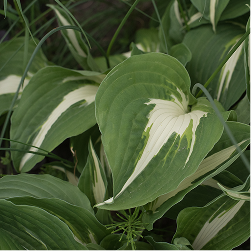 Листья крупные, плотные и морщинистые (жатые). Центр листа темно-зеленый или оливково-зеленый, по краю идет узкая кайма, которая весной имеет желтоватый оттенок, а к середине лета белеет.